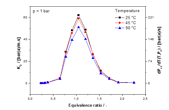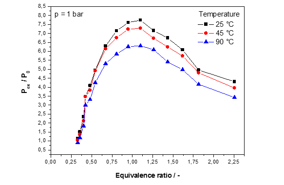 Fig. 3 illustrates the normalized peak explosion pressure (Pex/P0) versus equivalence ratios at atmospheric pressure and three initial temperatures. The maximum explosion pressure, pmax, was determined as the highest pex found for the mixture compositions investigated (Tab. 1).