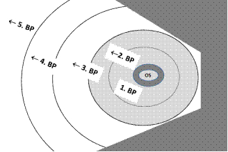 Obr. 2: Příklad bezpečnostních pásem (BP) pro ohrožující stavby s umístěním výbušnin třídy nebezpečí A.