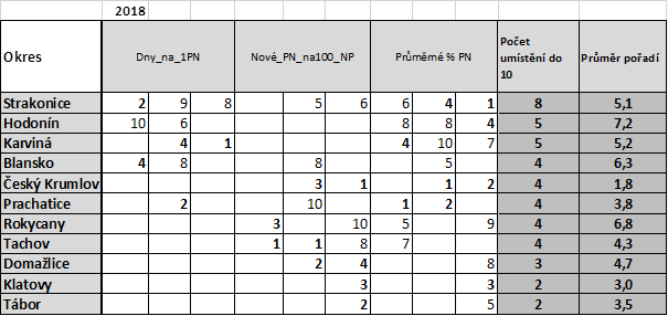 Vznikla souhrnná matice všech okresů, za celé časové období, s jejíž pomocí bylo možné vytipovat okresy, které se v posledních šesti letech umísťovaly na předních příčkách nejčastěji. Pozice okresů jsou dobře patrné v jejím výřezu na obrázku [10].