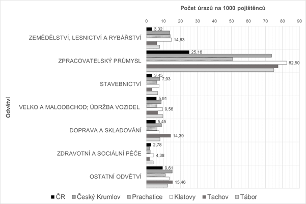 Ze srovnávací analýzy podle odvětví, která je graficky zpracovaná na obrázku č. 4, je jasně patrné, že všechny zvolené okresy převyšují ve většině odvětví průměrnou pracovní úrazovost v celé republice. Jako srovnávací relativní ukazatele byly zvoleny hodnoty počtu úrazů v odvětvích přepočítané na 1000 nemocensky pojištěných (tedy zaměstnaných) osob v daném okrese (příp. v ČR). Z těchto statistik také jasně vystupuje zpracovatelský průmysl jako hlavní rizikové odvětví, kde hodnoty v některých okresech několikanásobně převyšují republikový průměr. Příčinami tohoto stavu se bude řešitelský tým projektu dále zabývat zjišťováním dalších skutečností, a to i v navazujícím plánovaném šetření přímo v terénu v jednotlivých okresech [10].