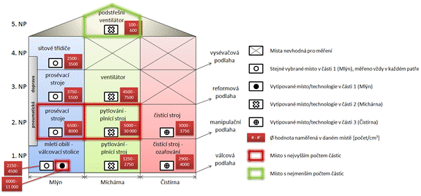Obr. 6: Schéma měření ve mlýně s naměřenými hodnotami [13].
