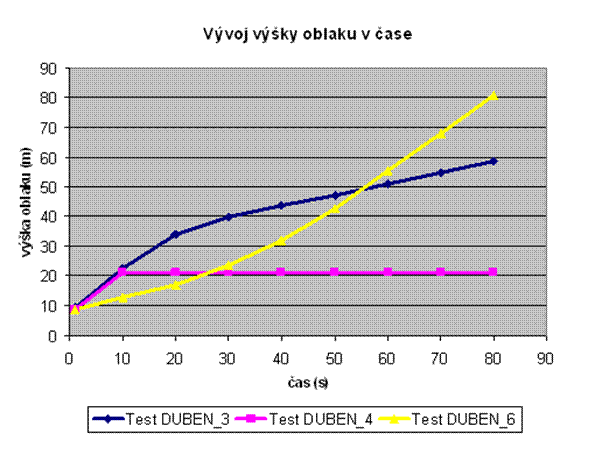 Obr. 8: Vývoj výšky oblaků v čase při různých stabilitních podmínkách (modrá – indiferentní teplotní zvrstvení, fialová – stabilní teplotní zvrstvení, žlutá – instabilní teplotní zvrstvení) [20].