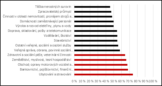 | Zdravotní a sociální péče, veterinární činnosti | 52,6% | 47,4% |